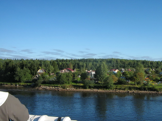 MS Shashkov - onderweg zo nu en dan kleurige huisjes op de oevers